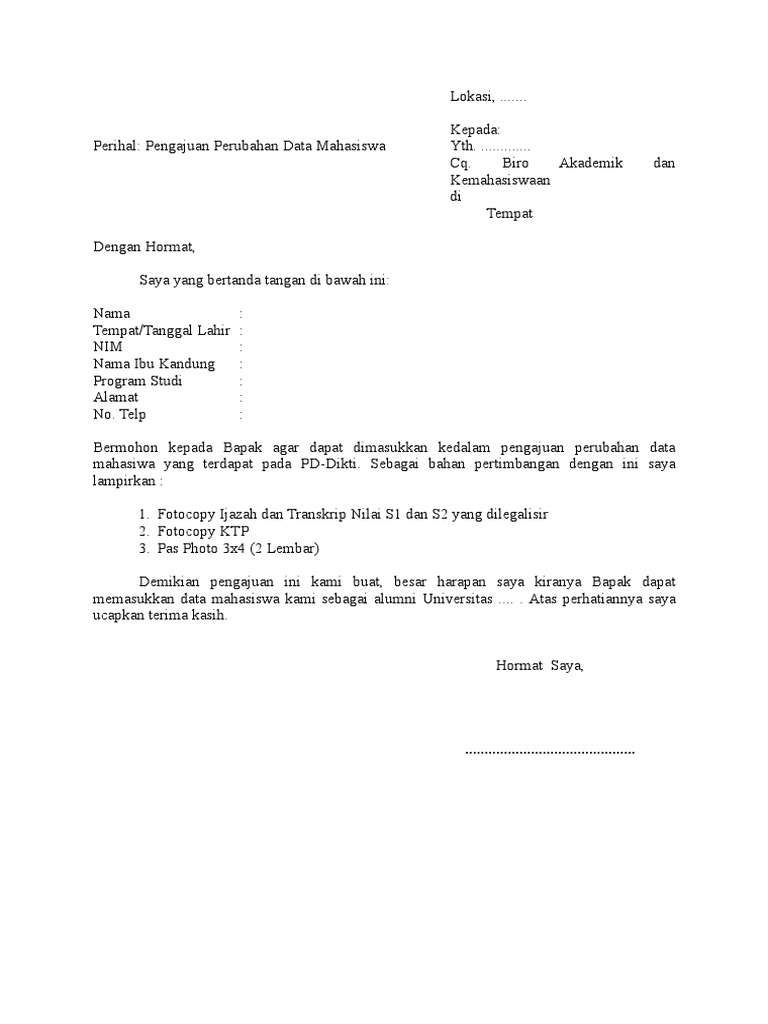 Contoh Format Surat Permohonan Perbaikan Data Mahasiswa PDM dari Pimpinan Perubahan namanimttl secara ektrim mohon penjelasan ke kopertis dan buat surat pernyataan dari pimpinan jangan merubah data mahasiswa. Contoh surat permohonan perubahan data berbagai keperluan sebagai referensi membuat surat permohonan perubahan data yang profesional. Menyatakan hal-hal sebagai berikut.