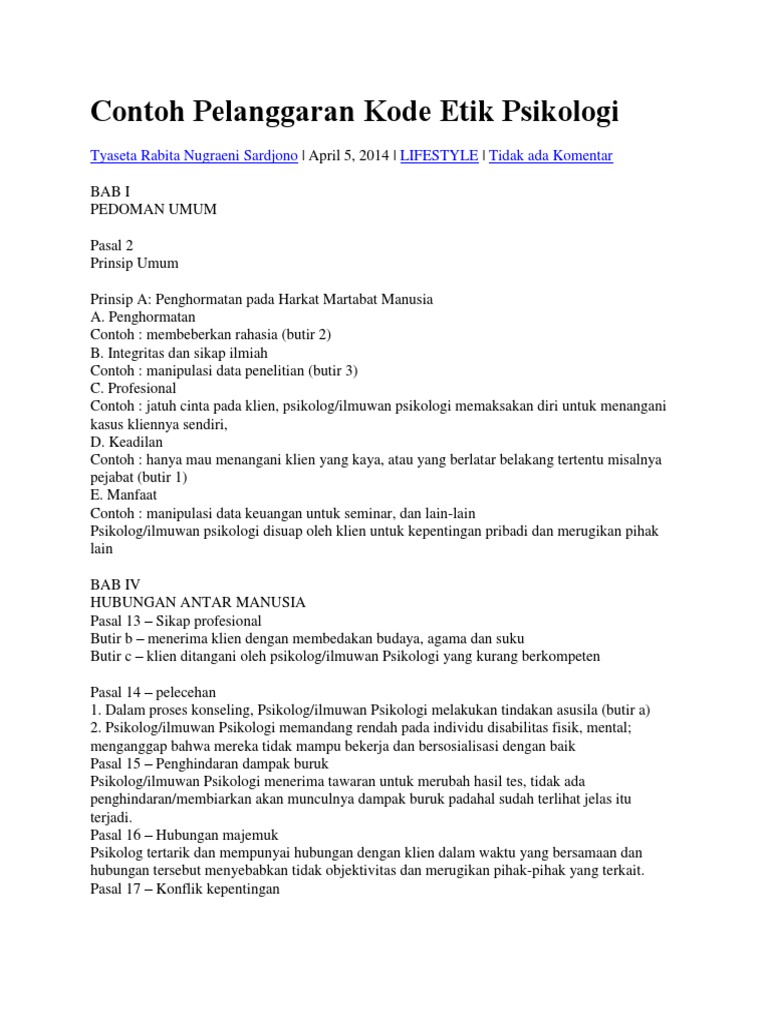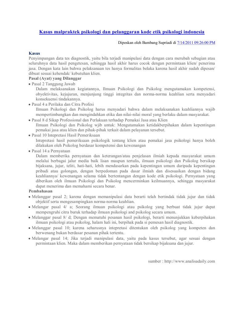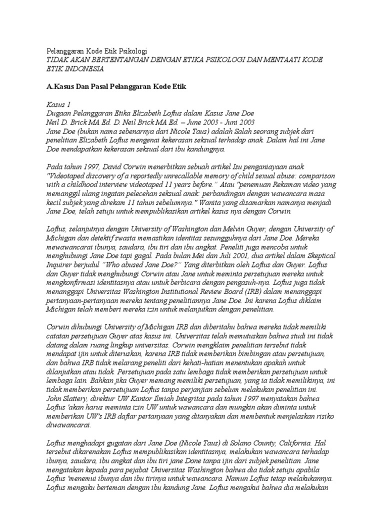 Jurnal pelanggaran kode etik psikologi. Dalam mewujudkan kemerdekaan pers itu wartawan Indonesia juga. Melaporkannya kepada HIMPSI daerah dimana biro psikologi itu berdiri dan akan ditindaklanjuti oleh majelis psikologi sesuai dengan pasal 3 ayat 2 kode etik psikologi Indonesia Melaporkannya kepada pihak yang berwajib dengan membawa hasil tes anak yang didiagnosa autis tersebut dan membandingkannya dengan hasil tes anak yang didiagnosa slow learned. Kode Etik Kebebasan berpendapat berekspresi dan pers adalah hak asasi manusia yang dilindungi Pancasila Undang-Undang Dasar 1945 dan Deklarasi Universal Hak Asasi Manusia PBB.